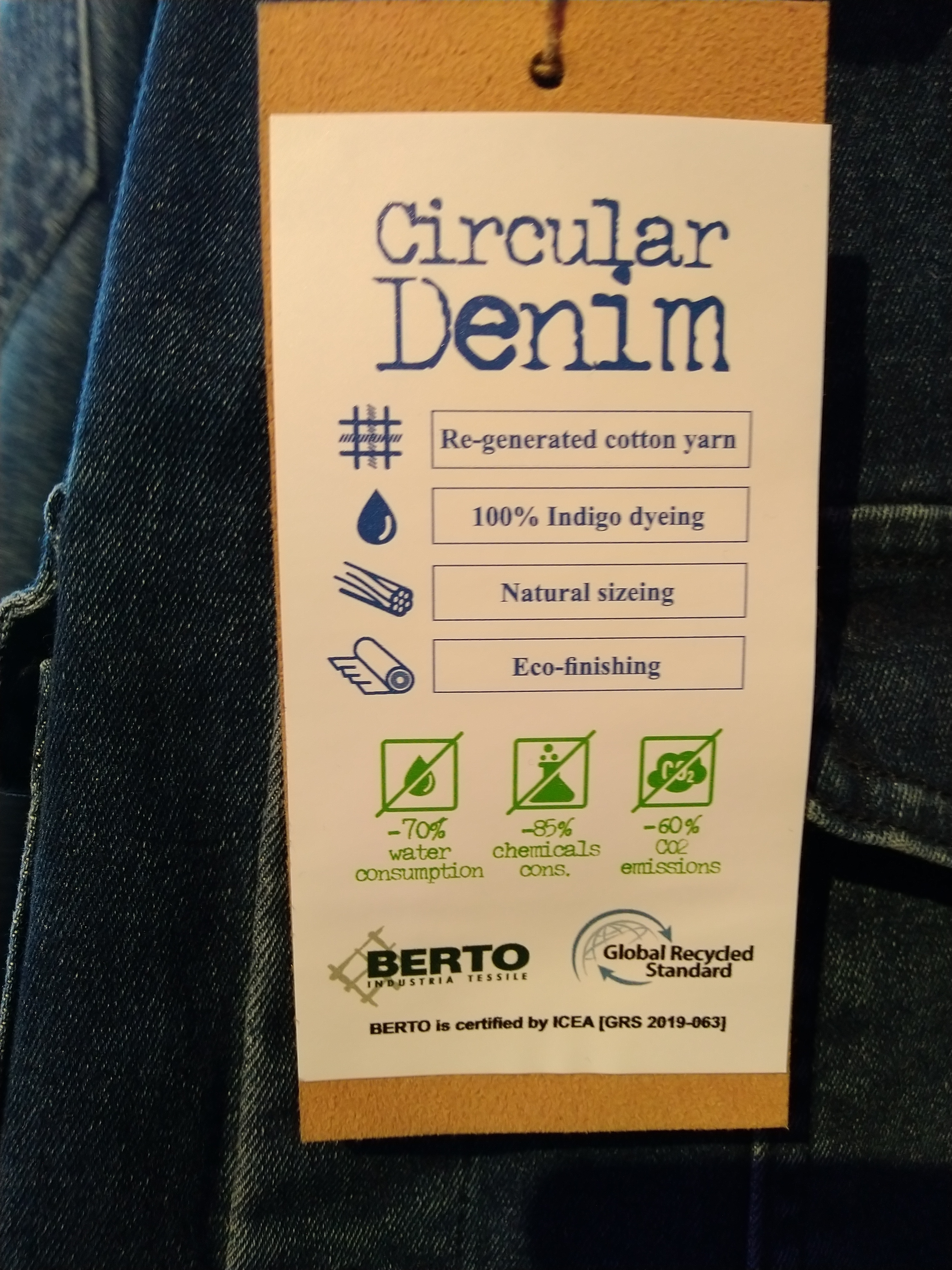 In Italia l’azienda BERTO produce tessuti in denim biologico e riciclato con un altissimo standard di qualità. Le materie prime sono: cotone organico, cotone BCI (Better Cotton Initiative), ECOTEC® YARN, un filato rigenerato dai propri scarti produttivi; il colorante utilizzato è l’indaco naturale certificato GOTS e la bozzima (il liquido colloso nel quale vengono immersi i filati prima della tessitura) è naturale e biodegradabile. Inoltre l’azienda ha scelto un sistema biologico di depurazione delle acque che sfrutta batteri e non agenti chimici, in questo modo i sedimenti che si ottengono diventano concime naturale per le piante. BERTO ha così ridotto del 70% il consumo di acqua, dell’85% l’uso di sostanze chimiche e del 60% la produzione di CO2.